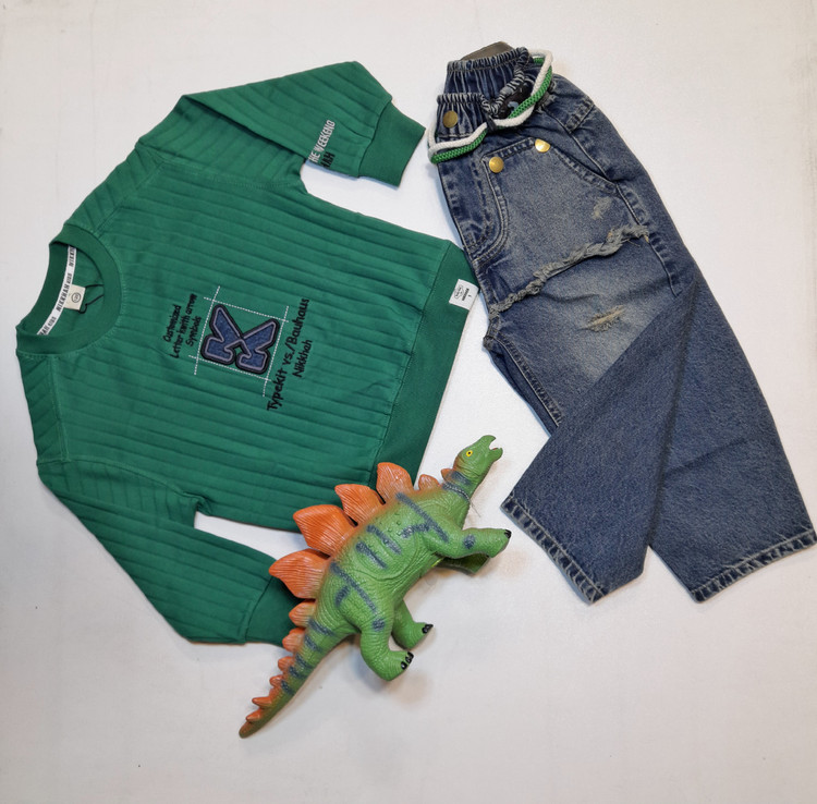 ست پسرانه لاکچری، جنس بلوز دورس مدل بلوز راهراه برجسته گلدوزی شده جنس شلوار جین مدل مام استایل، شستشو با ماشین لباسشویی