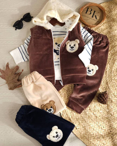 سه تیکه نوزادی ،پافر و شلوار مخمل+ بلوز آستین بلند دورس